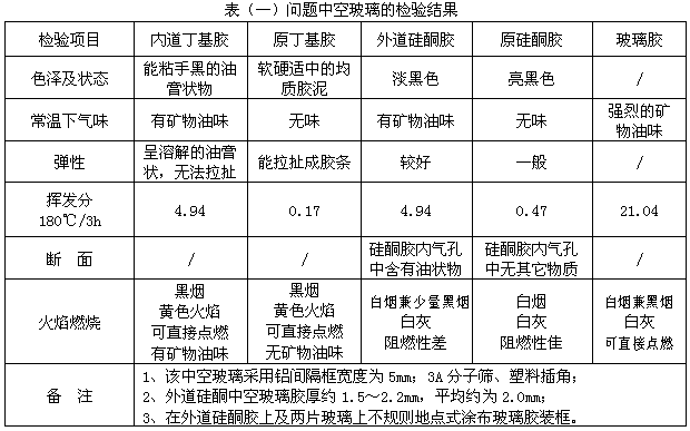 结露或结霜现象,中空玻璃完全密封失败!通过对已出现问题的中空玻璃进行检测分析,得到的检测结果见表(一)。该中空玻璃的内、外道中空玻璃密封胶与原胶均发生了性质变化,即硅酮中空玻璃密封胶内气孔充油呈溶胀现象,丁基中空玻璃密封胶由软硬适中的均质胶泥状态变成了能粘手黑的油膏状,呈溶解现象。其它如色泽、常温下的气味、火焰燃烧特性及挥发分也均发生了根本性的变化。