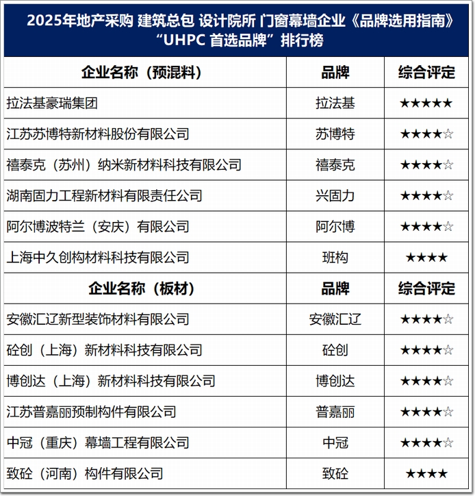 总之,“谁掌握了材料创新科技,谁就掌握了建筑的未来”,优秀的品牌,源自于优秀的企业,中国幕墙网ALwindoor.com将建筑用UHPC的五大要素(QEPMS)进行了整理,助您系统化的选出“好”产品,全面诠释2024-2025年度房地产、建筑业、设计院所,以及门窗幕墙市场中,首选的高端建筑UHPC“TOP”品牌。
