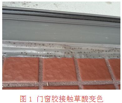 门窗胶接触到酸性物质时,可能会发生变色的情况。在建筑工地上,用到的外墙清洗液这类物质是有机酸(草酸)的水溶液,会对硅酮胶表面产生影响,从而导致硅酮胶表面变色。其变色的表现形式为门窗胶胶缝与草酸接触的部分出现深色或黑色的斑点,该现象在浅色的胶缝上表现较为明显。